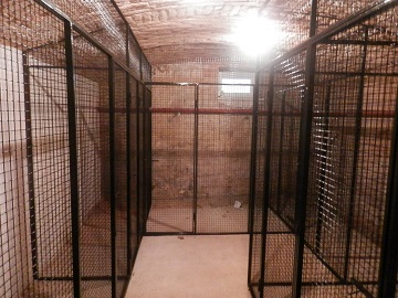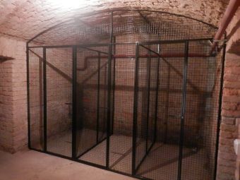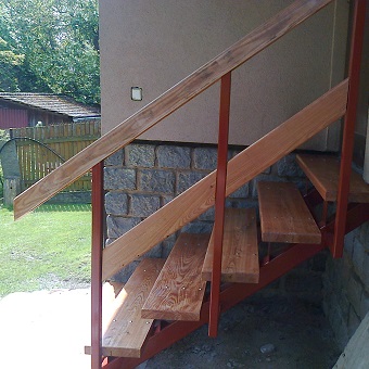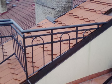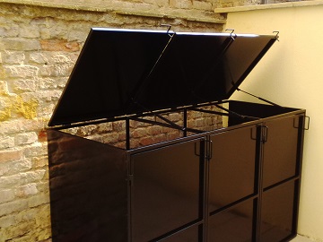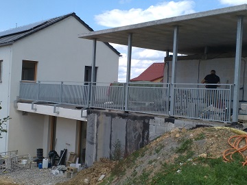 Kryty popelnic a zábradlí k balkónu střešního bytu v činžovním domě v Praze.